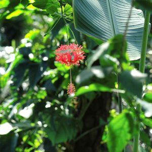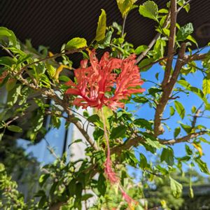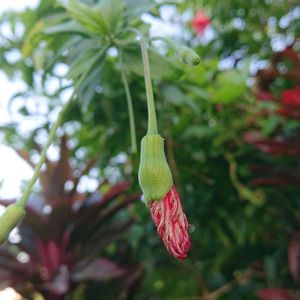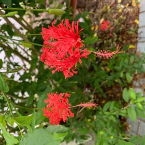🏷真っ赤な火曜日 赤いフウリンブッソウゲ(コーラルハイビスカス)の花が風鈴のように揺れて可愛いです❣️ ハイビスカスの原種です。 ハイビスカスは一日花ですが何日も咲きます。 東アフリカ原産 アオイ科 フヨウ属