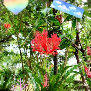 長い花茎からぶら下がる様に咲く姿は、フヨウ属(Hibiscus)の中でも独特です。 また、メラメラ燃える様な形の花弁も魅力です🥰 今日はキュンキュン乙女倶楽部活動の日 『赤い絆』投稿です。