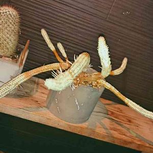 うちのロッキーこと白樺キリン。ほとんど直角に曲がった状態で鉢の縁に頭がついてたのですが、GS先輩のアドバイス通りに植え替えして水をザバーってあげたら、2段階前の角度まで回復しました‼️👯👯 この療法で、あともう2段階巻戻したいところ。