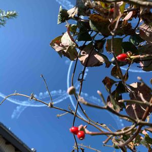 天高く 見上げた空には *⋆✈軌跡の花 今朝から同年会の旅行に出掛けた主人から 電話が、何事?かと 慌てて出たら、今日、自衛隊の小牧基地で 航空祭があるって.......内心なんだそんな事 と電話を切って朝ごはんを食べてたら 又電話が.......出たらブルーインパルも 飛ぶよって、またまた教えてくれた。 まあ、何時に飛ぶのかまでは分からないし タイミングが合えばって放置して 録画してたドラマを観てました。 いつもと違う音がするなぁと外に 出て、見上げたら、家の上を飛んで行く ブルーインパルスが*⋆✈ 植物と一緒にと ハナミズキの赤い実と一緒に 撮ってみました。 ヒヤミカチ首里城! ひやみかち首里城! ひやみかち日本!