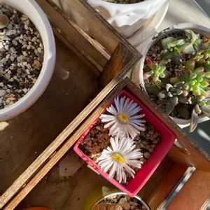 先週月曜、またまたホームセンターに多肉の土を買いに行っただけなのに、、、 だけなのにシリーズもできそう😆 リトープスお迎えしました❤️ 左上:その日、ツボミふたつ 真ん中:金曜午後、突然咲き始め二度見しました 右上:金曜夜、さらに開きました 左下:土曜日朝にはまた花が閉じました のでしばらく楽しめそうです😄🫠 フリマアプリで購入した寄せ植えの名前の分からない多肉ちゃん、小さくて赤いかわいいお花が咲きました💕🫠