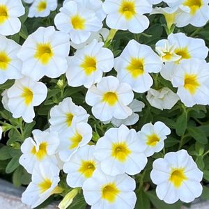 ✿♬゚+.✿♬゚+.カリブラコア✿♬゚+.✿♬゚+. ウノホワイトイエローアイ 切り戻しからたくさんのお花を咲かせてくれました。 秋まで長く咲いてくれるカリブラコアの中でも健強なタイプです。
