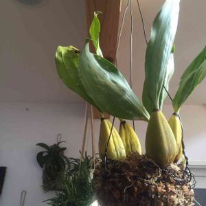 夏前に近所の園芸店で特価処分品にならんでたバナナもどきちゃん。 外でモスに突っ込んで放置してたら、えらい大きくなってしもた〜😬😳 さすがに冷えるし、家の中に入れて吊るしてみたけど、名前がイマイチワカラニャイ。ネームタグは付いてるけど、カタカナで洋名が書いてあって、いくら調べても出てこない😑😑😑 どなたか教えていただけますか〜?