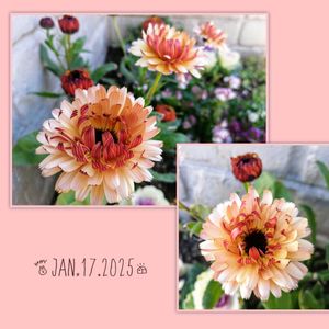 おはようございます🌅 今日のお花キンセンカ🌿🧡🌿 キク科キンセンカ属の一年草🌿 ①寒中の寒さにも負けず 咲き始めたカレンジュラ・ コーヒークリーム🌿🧡🌿 ②いつもの散歩道の花壇は こんな感じです💐💐💐 ③蕾も咲き始めも可愛い🌿🧡🌿 🏷️金曜日の蕾たち 🏷愛の花♡ 🏷復興を祈る ①②今朝の散歩道で🌅 ③今リビングで💐
