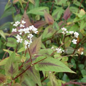 ペルシカリア レッドドラゴン ブロンズ色や緑色の葉に赤い模様が入るカラーリーフが美しい植物です。我が家の庭でもアクセントになっています。白い小花も可愛いですよ。