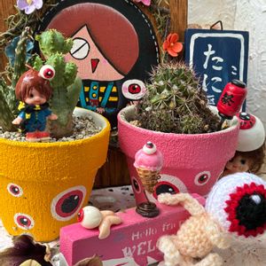 1〜3枚目 🏷️オヤジ祭り2025 1枚目 みたりん産オヤジ鉢2種とオヤジピック2種😍💕 けいこさんの編み編みオヤジにハッピ着せてみたよ〜🤣🎶💕 ミャクミャクオヤジキュピちゃんも🤣💕 ドールボディで猫娘作ってみたけど、下手っぴ〜🤣💦 2枚目 こちらもみたりん産!アヒルに乗ったオヤジ鉢💕 一緒にコラボ💞ヽ(^。^)ノ🎶 みたりんさんの鬼太郎&オヤジBoard「ゲ」最高!!🤣👍️💕 3枚目 KOHさんのオヤジおぼうぼピータン鉢と月の雫さんのオヤジおぼうぼピータン、ピータンおぼうぼオヤジ、お花オヤジピータン(名前ど忘れ🙏)🎶 マイメロちゃんの鬼太郎キュピちゃん💕 4枚目 🏷️にぃさんの日 息子に買ってもらった斑入りウチワサボテン、結構大きいんです!デカチキンよりも背が高い🤣🤣🎶 5枚目 アップで 「ギャー‼️」🤣🤣🤣🎶