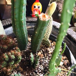 おはようございます☀ 今日は🏷にぃさん日 サボテン🌵の寄せ植え20年くらい育てている名無しの棒サボテンが伸び過ぎて 自立出来なくなり思い切って胴切り✂️ やっと子株ちゃん✨ にぃさん!! 食べちゃう気⁇🤣🤣🤣 口切れちゃうんじゃないの??