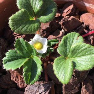 いちごの花が咲きました〜🎶 かわいい💕 だけど、最初の花は摘んだ方が良いとありました… 今日一日眺めてから摘みます…。 葉がモリモリしてないけど、これからかな?