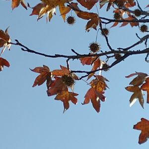 モミジバフウノキ 散り残った葉と可愛い実 穏やかな師走の陽射しの中 青空に映えて