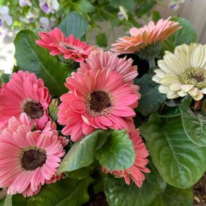こんにちは☀️ミニガーベラです🌸🌸 冬を超えてくれてまた咲いてくれてます ピンク色のお花はギュウギュウになってますが😅 この写真は先月のものですが 今も元気に咲いてくれてます✨✨✨