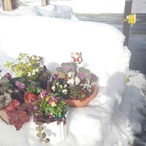花壇で雪上 日なたぼっこ☀️ 今日のお花 ヒューケラも 北向き玄関前は凍ってる❄️