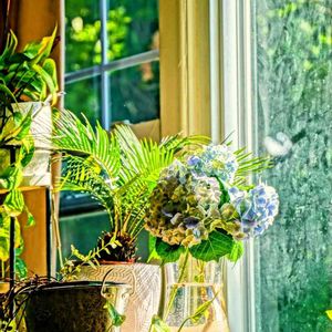NewYork 🌱 Beautiful Hydrangea ✨ Part2 前庭の紫陽花が美しく色付き始めました。私の一番好きなグリーンとブルーのアースカラーの花たちを窓辺に飾りました。✨🌎✨ Part1の背景がこちらです。窓の外の輝く木々は紫陽花の美しさを褒め称え、紫陽花は木々に小声でありがとうと呟いている🙄🌿✨そんな想像をしてしまいましたぁ〜🤭💭💕