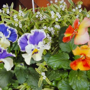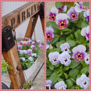 おはようございます🌞 玄関においてある鉢も、植え替えをしました😃 パンジーは、左がマリアブルーオーシャン、右がみやび・キューティーアプリコットです🌼 一緒に植えたのは、スーパーアリッサムで、初めて育てていますが、どんどん覆ってくれる感じで、可愛く、しかも華やかです。葉が斑入りなのも気に入ってます😌🌸💕