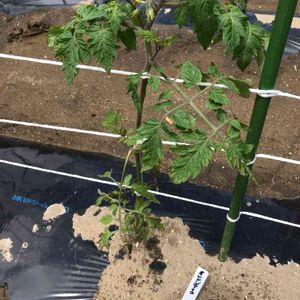 畑のミニトマト🍅、オレンジアイコの様子です。 順調に成長してきまして、一番花が咲きました。 脇芽もたくさん出ていますので、芽かきをします。 今年もたくさん採れるといいのですが。