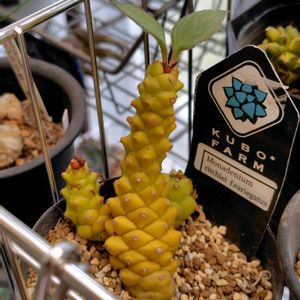 こんばんは〜☺️ 行ってきました、樹祭🌳🏮✨ 一時期のような入場制限もなく(2日目だからかな?)ゆっくりと見て回ることが出来ました 3鉢ほどお迎えしたので順番に紹介、記録させていただきます📱 モナデニウム グラキレ❣️ 背の高さ約5cm ちっちゃ‼️‼️ アップにしないとよく見えない でもこの可愛さ😍😍 お花も咲いていてしかもお花、変🤣‼️ お花の中からお花垂れてる〜 いや、白いのはきっと萼だね MONETさんよりお迎えしました どんどん大きく成長してくれますように🙏