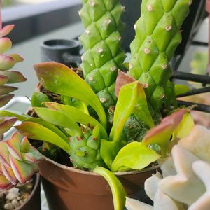 モナデニウム ヘテロなんとか?? 葉っぱが赤く色付いていてきれいです🥰 2:ユーフォルビア 孔雀丸 ふたつだけお花が咲きました🌼 スーパーのお花売り場出身のちょっとひょろいコ🌵 しっかりたくましく育てていきたいです💪💪 3:同じくスーパーでお迎えのガガイモさんたち💚 ガガイモ育成レベルが全然アップしないのに根こそぎ狩ってしまいました🏹