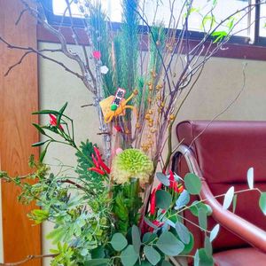 ~年末年始のお花~ ユーカリの香り爽やかに🍃 先日購入の雲竜桑を生けてみました。恥ずかしながら去年よりは上達した気がします♪自家製が飾れる喜びは一入ですね✨ 来年は更に上達できるよう写真に残します📷️ 🌹花材🌹 ・雲竜桑 ・スプレーマム(緑) ・黄金猫柳(枝) ・こでまり(枝) ・レモングラス(我が家の剪定物) ・唐辛子(我が家の剪定物) ・ミモザ(我が家の剪定物) ・アジアンタム(我が家の剪定物) ・スティックセニョール(我が家の剪定物) 初めての生け花は↓タグ✨✨タップでご覧いただけます