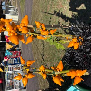 キュンキュン乙女倶楽部さんの 🏷𓈒秋満喫しよう 飛び入り参加させてくださいね🎶 カナリアナス🍆 別名フォクスフェイス🦊 鑑賞用ナスビです🧡 実がキツネのお顔に 見えます🦊実を逆に見てね🤣 撮影の腕前悪いから🐙に見えるけど〰!! 高野山の麓で 農家さんが栽培されてます🍆🧡 種摂って来年チャレンジしたいです(,,>᎑<,,)♡