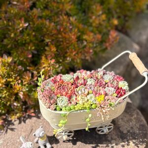* このところ… 日中はポカポカ陽気☀️ 寄せ植えスイッチ入ったので 仕事に行く前に〜 最近お迎えしたブリキワゴンに 韓国苗のチビ苗で寄せ植えしました🤗💕