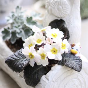 プリムラ🌼ワンダ ライト♡ ダークな葉っぱに淡い花色が可愛いくて また増えましたw ふくろうの鉢にぴったり🦉💞 (横顔だけど) 今日は、やっとツリーを出すよ🎄 良い1日を〜❄️✨