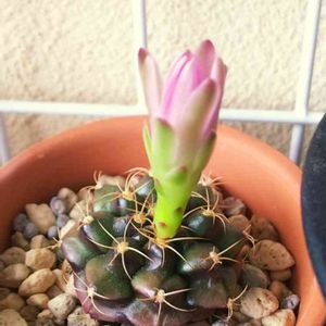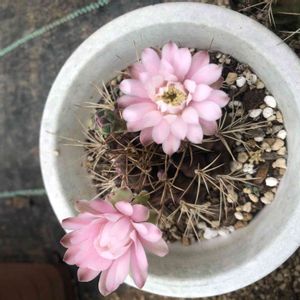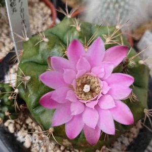 ギムノカリキウム、麗蛇丸✨ 曇り多いし、仕事だしで見れなかったお花🌸ようやく拝めました🙏❤️ ピンクに緑が混じって可愛い💕 一寸鉢の小さな体ながらお疲れ様🤗🎵 花終わったら植え替えてあげるからね!笑
