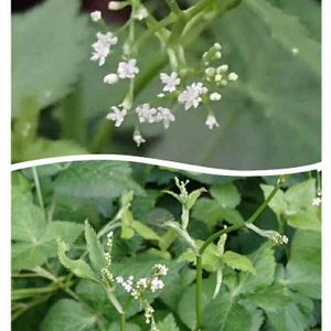 黒い蝶々(名前がわからない)が夢中になっている、この小さな白いお花の名前をご存知ですか? 葉っぱの形が特徴的なんですが……