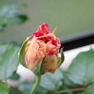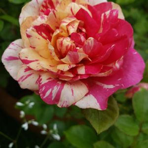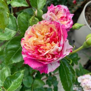 🇫🇷フレンチ・ローズ (2016年デルバール) エドゥアール・マネ🌹 ☀️暑くなる頃から元気になり、花弁も増えて次々花を咲かます♪ まだ色は薄いですが、花弁の数も増えてきて、中がロゼットになってきました 😊 これから気温が上がるほど色濃くなって、鮮やかな ローズXイエロー💖 のクッキリした絞り咲きになります。 他のバラ🌹が暑さでお休みしてるときでも、夏らしいトロピカル・カラーで元気いっぱいに咲いてるバラです (*´∇︎`*)♪︎.*:・