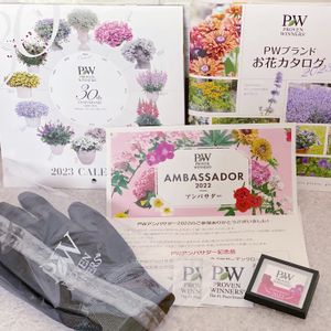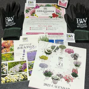 PWアンバサダー記念品💚 記念バッチ、ガーデングローブ、お花カタログ、カレンダー届きました😊 PW様 ありがとうございました🤲