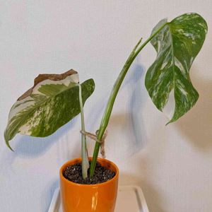 この斑入りモンステラちゃん。 チラっと新芽見えてたけどずっと動かなくて…育成ライト当てたのがよかったのか2ヶ月たってやっと動いてきたよ♡(画像は11月)