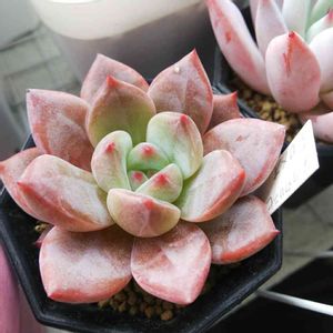 【 ラウリンゼ×ロメオ 】 少し赤みが薄くなってしまった? 真ん中が白っぽくなってしまって 日照不足かと思っていたけど この時期は真ん中白くなるものだと はっちさんに教えてもらいました。 そういうものなのか。 鉢底から少し根っこ出てきた。 でも春までこのままね。