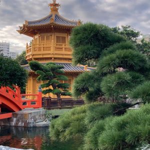 ブーゲンビリア🌺香港、志蓮淨苑、本堂の手前にて。睡蓮の池とも調和して盆栽、素晴らしいです👍😃🎶
