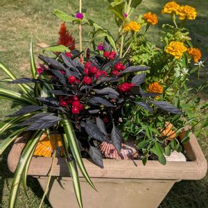 初めて🎃ハロウィン仕様の寄せ植えを作りました。 💜🧡🖤💚💛🩷🤎カラー合わせだけでハロウィン仕様になってるかどうか…😅🤭 オリヅルランは我が家の物を隙間に😁