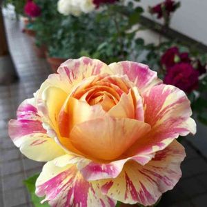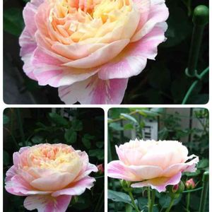 Claude Monet クロード モネ 作出 2012年 フランス Delbard 系統 S シュラブ 交配 未発表 花色 黄とピンク絞り 花形 ロゼット咲き 花径 中輪 芳香 中香 香質 ティーとパウダー 開花 四季咲き 樹高 1.1m デルバールのバラと言えば花は可愛いけど巨大化するというイメージが強かった💦 大好きなナエマ姫はその最たるもので地植えにしたらのびのびと、それはもうのびのびと育っています(´・ω・`;) だ·け·ど♪ このクロード・モネは完璧に木立タイプ💕 コンパクトにまとまるけど樹勢は強くてちょっと葉を落としてもしっかり復活してくれる育てやすさ(*´ω`*)香りも大好きなティーがベース。 ティー系の香りってダマスク系程の強香にはなりにくいみたいですが、派手さはなくても爽やかで飽きのこない香りです💕✨✨ もーかーわーいーいー❣️❣️