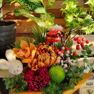 少し早いのですが、お正月の花を生けました。 ピンクの蘭、紫のアイリス、黄色のピンポンマム、大王松、銀色の柳、千両・・個性豊かな花達ですが、仲良く一つの花器に収まってくれました😊 1年間ありがとうございました。 どうか良いお年をお迎えください🙇💓