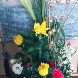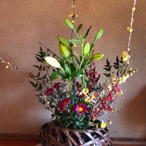 新年明けまして、おめでとうございます。 今年も宜しくお願い致します。 毎年暮れに義妹の所から届いた、百合と自宅で咲いている、蝋梅、寒菊、南天で、正月🎍用の、生花を飾りました。