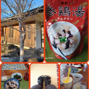 今晩は🌃✨ 今日は午後から 笑いヨガ😊で一時間笑い転げてからのお茶飲み会ですおやつ🕒️を食べて~の温泉♨️で🚶♀️ サウナ🚿に入ってからの歩行浴で40分歩いてカロリーを消費してきて~の晩ごはん🌃🍴は 🍚ご飯にかけて食べる参鶏湯を頂きました😋 温泉♨️の入り口にあるシャラの木です🌲