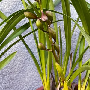 シンビジウム🌸🌿 留守がちの自宅にあるシンビジウム。 先月蕾は確認していましたが、大きく育っていました✨💓 色合いは違いますが、同じ鉢の蕾です。 もう25年以上育てていますが、手間もかけてあけていないのに何とも優秀🥰💖