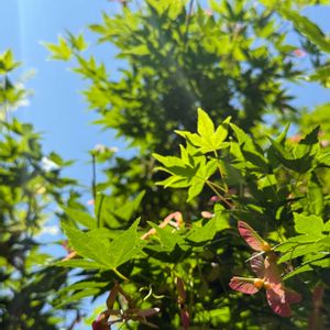 『ヤマモミジ』 今日は予定があって、お仕事お休み取ったのに、午前の予定がドタキャン💦 午後からの予定はあるので 高速使って遠出🚗もできないし。 ま、いっか🙄 旅行者のフリして、スマートインターのSAのベンチで☕️タイム 空が抜けるように青くて、日差しを受けたヤマモミジが綺麗です。 ピンクのプロペラが時折優しく吹き抜ける風に揺れてクルクルと飛んでいきそうです😊 前を通る人たちに、いかに旅行者に見られるように振る舞うか🤔 何にチャレンジしているのか不明ですが、これはこれで面白いです笑