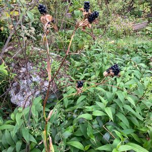 足の踏み場もないほど繁った庭の片隅で、ヒオウギの種が。 ぬばたまの…万葉の歌にも出てくる髪の黒や夜の枕詞につかわれた、黒くて光沢のあるヒオウギの種の事だそうです💛🍂