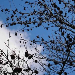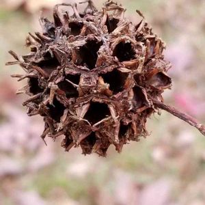 秋風景 その3 モミジバフウの実、陽の当たる方だけ赤く色付いてる🤗 出店で見かけたような🙄 アンバーバームになるには、もう少しかかるね😉