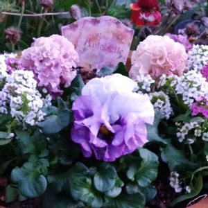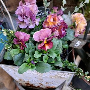 アンティークビオラと葉牡丹の寄せ植え ファルファリアNo.84 クリーム色に薄紫が素敵なビオラが綺麗です☺️