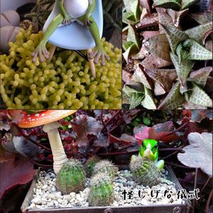 「I love はちゅ」参加します ↖️チェア(\100 税抜き)を貰って寛ぐカエル🪑リプサリスの上で ケレウスクラとピロカルパ ↗️雨晒しで雑なので今後はもう少しキレイに育てたい… ハオルチア 竜鱗 ⬇️世界の図の掻き仔(←だけど斑がよく見えないので短毛丸)を適当に植えて放置してたら酷い有様(!!)だったのでまとめてみた ヤモリマグネット付けてカエル置いたら怪しい儀式が始まった ๛๛ก(ー̀ωー́ก) 復活してキレイに育ちますように~~