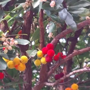 おはようございます♪ 散歩道に🔴🟡赤や黄色い実がなって⚪️白い花も咲いてます 🍓イチゴの木🍓 ツツジ科イチゴノキ属 開花期11〜12月 果実は年を越し翌秋に緑色から黄色、赤へと変化しながら晩秋に成熟します