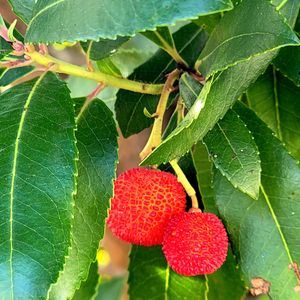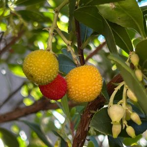 イチゴノキ🟢🟡🟠🔴 散歩の途中でいつもの所で出会いました。 今年も道端でオレンジ色や、赤い実を付けています。 花と実を同時に見られるので嬉しいです。 食べても美味しくなく、果実酒やジャムに。