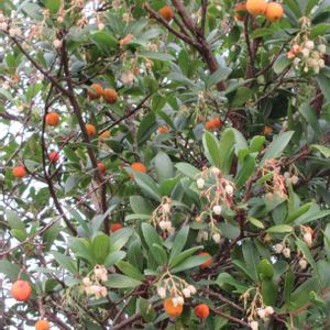 イチゴノキ(苺の木) 橙色の実は 1年前の花からできた実が熟したものです。 花と実の 時を重ねて イチゴの木