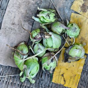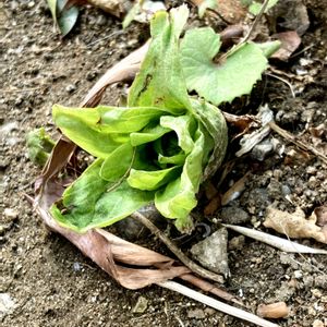 今日のお花 フキ ①去年は不作でした。 ②裏庭の蕗の根元を覗いてみると🕵️ 今年は、沢山採れそうです💚