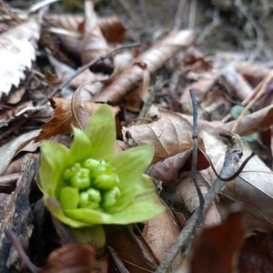 おはようございます☁️ お寺の裏山にて 小さなスミレの株を 何株か見つけました。 まだ気温が低いので 縮んだ草丈ですが、 咲き始めてました。 3/10 タチツボスミレですね💜💚☘️ 近くにフキノトウが1つだけ生えていました。