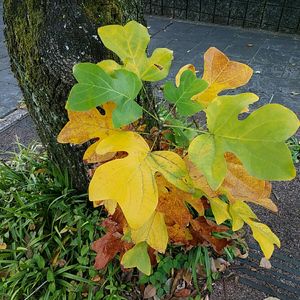 ユリノキ(百合の木▪百合木) モクレン科ユリノキ属の落葉高木 街路のユリノキ並木から、少し離れた所に芽生えたユリノキの幼木が、黄葉していました。 葉は、普通、4~6に浅く裂けるそうですが、園芸品種では、葉の形は変化が多いそうです。 葉っぱの形が、半纏に似ているので「ハンテンボク」の別名もありますが、半纏というより、この木の葉っぱは、割烹着やワンピースに似ているかな~(’-’*)? と思いました。