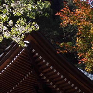 ヒマラヤザクラと紅葉が、 仁王門を守っているかのようでした。