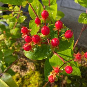 実家のヒペリカム 花が終わった後の実がかわいい❤️ 赤、緑、ピンク、茶… 何種類出回ってるんだろうね? 実家のは、地植えだから大きい 冬の剪定が大きく左右する😊 刈り込みが大事